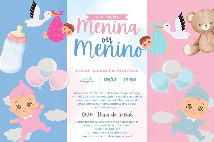 Venha prestigiar, celebrar a vida e descobrir se teremos um meninO ou uma meninA na família COHAB!